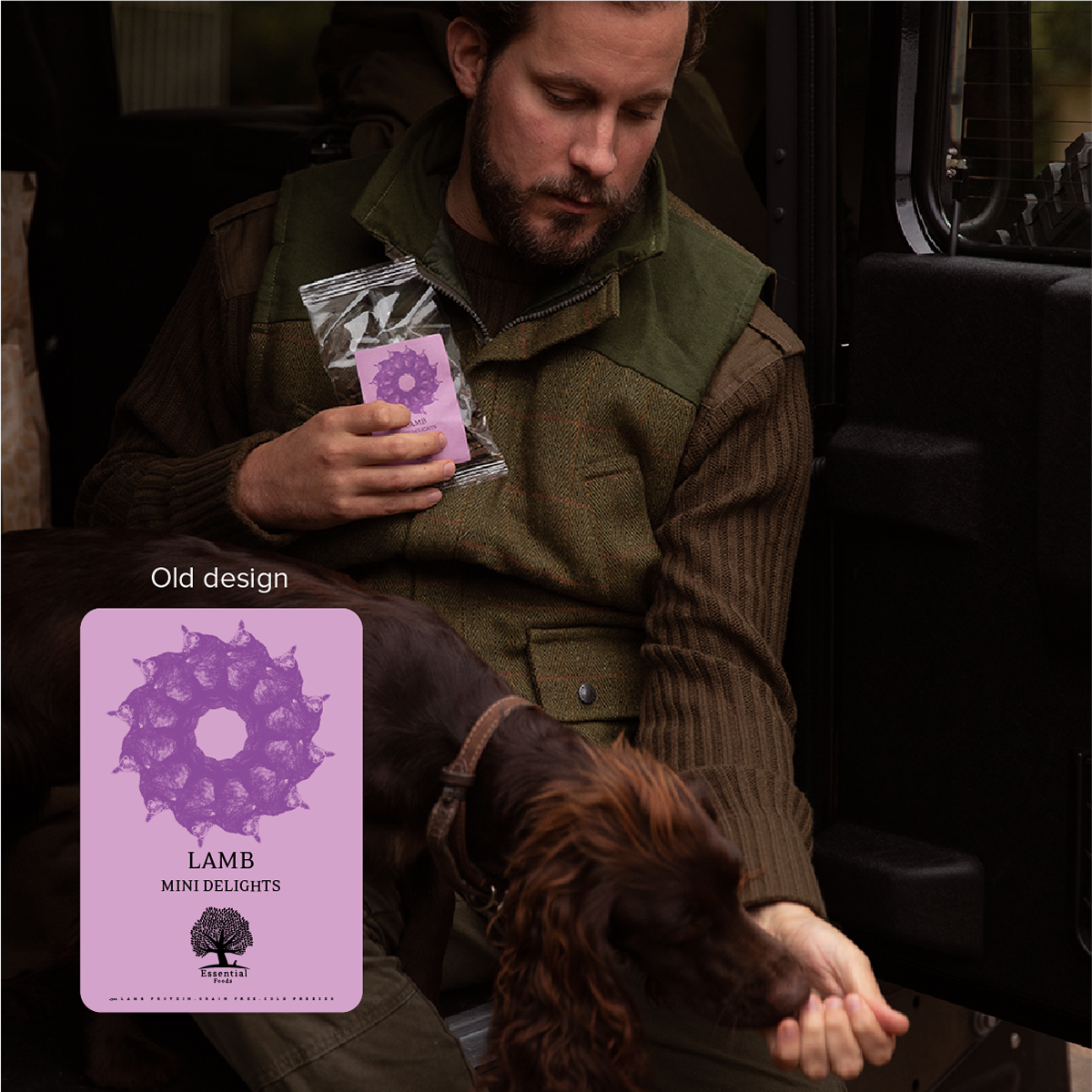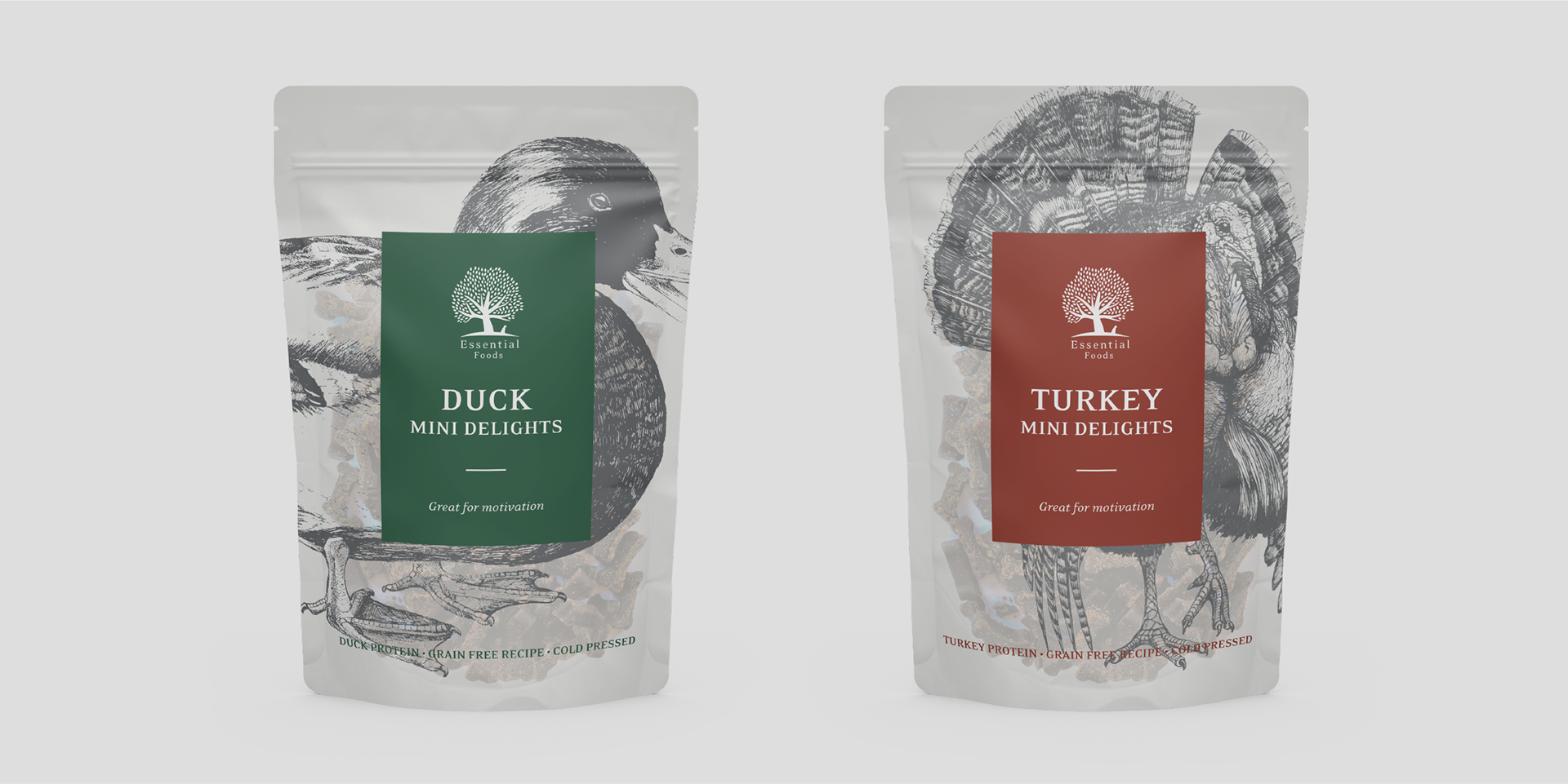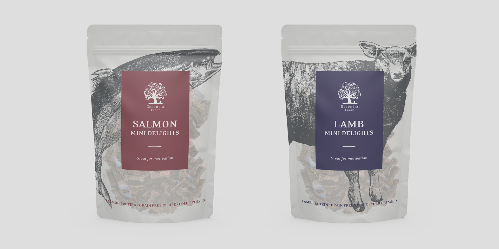 About the project: The Mini Delights packaging is re-designed for Essential Foods in 2020. The Mini Delights series consists of Duck, Lamb, Salmon and Turkey (added in 2020) treats. The treats are very popular and the packaging was to be brought up to date.